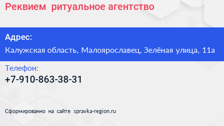 Реквием+, ритуальное агентство по адресу Калужская область, Малоярославец, Зелёная улица, 11а в дальнейшем Организация, размещена в следующих категориях: