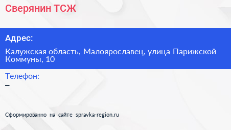 Сверянин, ТСЖ по адресу Калужская область, Малоярославец, улица Парижской Коммуны, 10 в дальнейшем Организация, размещена в следующих категориях: