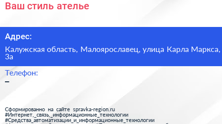 Ваш стиль, ателье по адресу Калужская область, Малоярославец, улица Карла Маркса, 3а в дальнейшем Организация, размещена в следующих категориях: