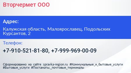 Вторчермет, ООО по адресу Калужская область, Малоярославец, Подольских Курсантов, 2 в дальнейшем Организация, размещена в следующих категориях: