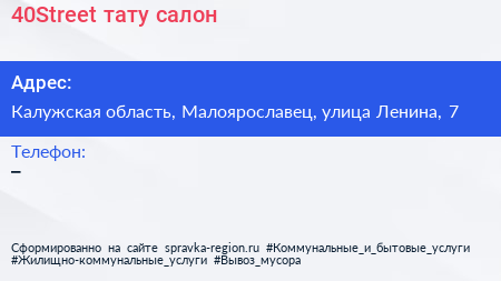 40Street, тату-салон по адресу Калужская область, Малоярославец, улица Ленина, 7 в дальнейшем Организация, размещена в следующих категориях: