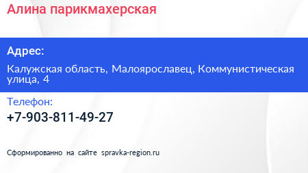 Алина, парикмахерская по адресу Калужская область, Малоярославец, Коммунистическая улица, 4 в дальнейшем Организация, размещена в следующих категориях: