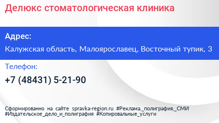 Делюкс, стоматологическая клиника по адресу Калужская область, Малоярославец, Восточный тупик, 3 в дальнейшем Организация, размещена в следующих категориях:
