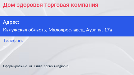Дом здоровья, торговая компания по адресу Калужская область, Малоярославец, Аузина, 17а в дальнейшем Организация, размещена в следующих категориях: