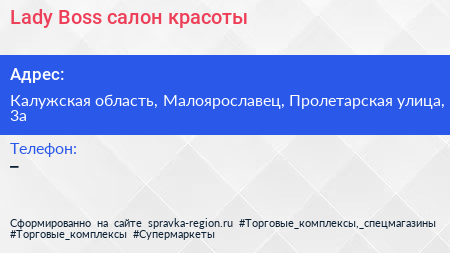 Lady & Boss, салон красоты по адресу Калужская область, Малоярославец, Пролетарская улица, 3а в дальнейшем Организация, размещена в следующих категориях: