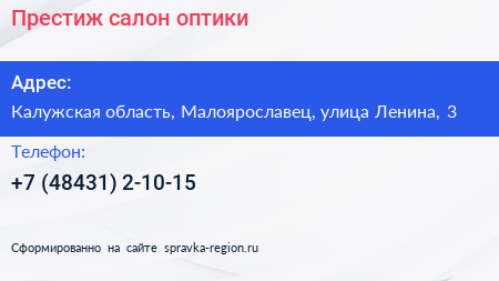 Престиж, салон оптики по адресу Калужская область, Малоярославец, улица Ленина, 3 в дальнейшем Организация, размещена в следующих категориях: