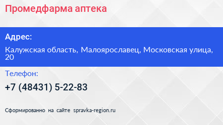 Промедфарма, аптека по адресу Калужская область, Малоярославец, Московская улица, 20 в дальнейшем Организация, размещена в следующих категориях: