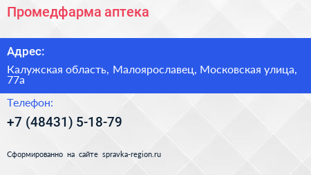 Промедфарма, аптека по адресу Калужская область, Малоярославец, Московская улица, 77а в дальнейшем Организация, размещена в следующих категориях: