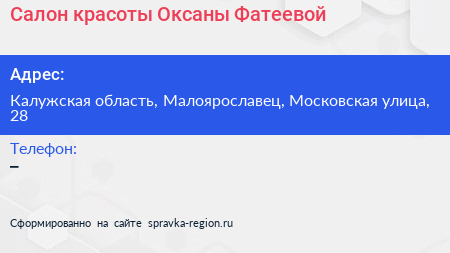 Салон красоты Оксаны Фатеевой по адресу Калужская область, Малоярославец, Московская улица, 28 в дальнейшем Организация, размещена в следующих категориях: