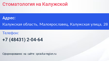 Стоматология на Калужской по адресу Калужская область, Малоярославец, Калужская улица, 28 в дальнейшем Организация, размещена в следующих категориях: