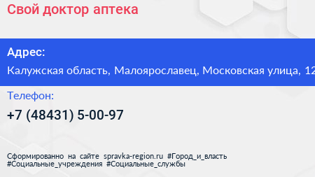 Свой доктор, аптека по адресу Калужская область, Малоярославец, Московская улица, 12 в дальнейшем Организация, размещена в следующих категориях: