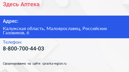 Здесь Аптека по адресу Калужская область, Малоярославец, Российских Газовиков, 6 в дальнейшем Организация, размещена в следующих категориях: