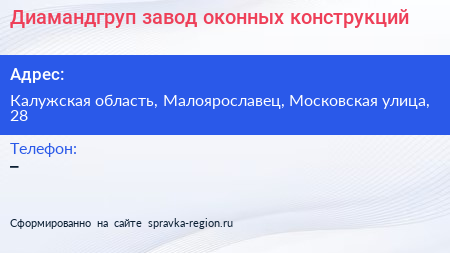 Диамандгруп, завод оконных конструкций по адресу Калужская область, Малоярославец, Московская улица, 28 в дальнейшем Организация, размещена в следующих категориях:
