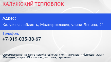 КАЛУЖСКИЙ ТЕПЛОБЛОК по адресу Калужская область, Малоярославец, улица Ленина, 21 в дальнейшем Организация, размещена в следующих категориях: