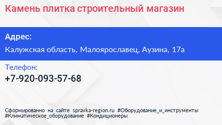 Камень-плитка, строительный магазин по адресу Калужская область, Малоярославец, Аузина, 17а в дальнейшем Организация, размещена в следующих категориях: