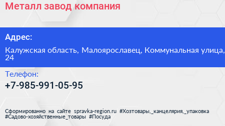 Металл-завод, компания по адресу Калужская область, Малоярославец, Коммунальная улица, 24 в дальнейшем Организация, размещена в следующих категориях: