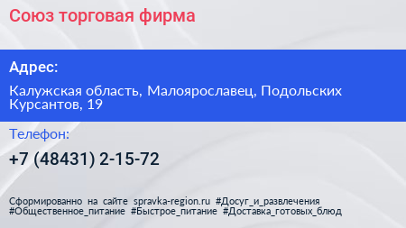 Союз, торговая фирма по адресу Калужская область, Малоярославец, Подольских Курсантов, 19 в дальнейшем Организация, размещена в следующих категориях: