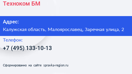 Техноком-БМ по адресу Калужская область, Малоярославец, Заречная улица, 2 в дальнейшем Организация, размещена в следующих категориях: