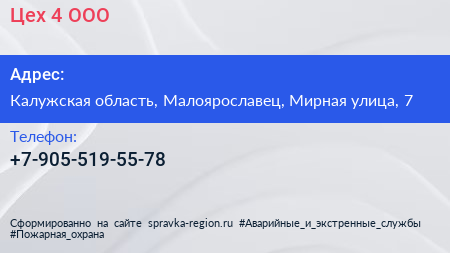 Цех №4, ООО по адресу Калужская область, Малоярославец, Мирная улица, 7 в дальнейшем Организация, размещена в следующих категориях: