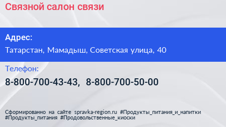 Связной, салон связи по адресу Татарстан, Мамадыш, Советская улица, 40 в дальнейшем Организация, размещена в следующих категориях: