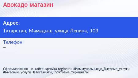Авокадо, магазин по адресу Татарстан, Мамадыш, улица Ленина, 103 в дальнейшем Организация, размещена в следующих категориях: