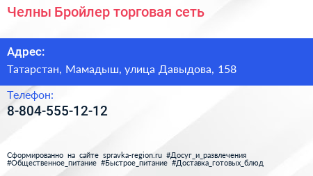Челны-Бройлер, торговая сеть по адресу Татарстан, Мамадыш, улица Давыдова, 158 в дальнейшем Организация, размещена в следующих категориях: