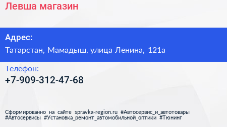 Левша, магазин по адресу Татарстан, Мамадыш, улица Ленина, 121а в дальнейшем Организация, размещена в следующих категориях: