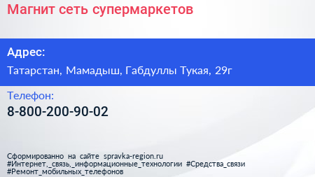 Магнит, сеть супермаркетов по адресу Татарстан, Мамадыш, Габдуллы Тукая, 29г в дальнейшем Организация, размещена в следующих категориях: