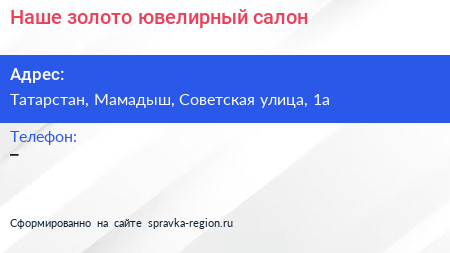 Наше золото, ювелирный салон по адресу Татарстан, Мамадыш, Советская улица, 1а в дальнейшем Организация, размещена в следующих категориях: