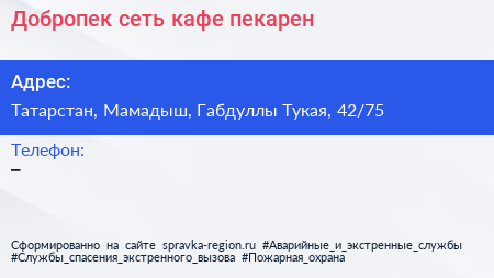 Добропек, сеть кафе-пекарен по адресу Татарстан, Мамадыш, Габдуллы Тукая, 42/75 в дальнейшем Организация, размещена в следующих категориях: