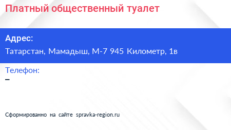 Платный общественный туалет по адресу Татарстан, Мамадыш, М-7 945 Километр, 1в в дальнейшем Организация, размещена в следующих категориях: