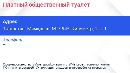Платный общественный туалет по адресу Татарстан, Мамадыш, М-7 945 Километр, 2 ст1 в дальнейшем Организация, размещена в следующих категориях: