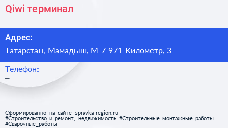Qiwi, терминал по адресу Татарстан, Мамадыш, М-7 971 Километр, 3 в дальнейшем Организация, размещена в следующих категориях: