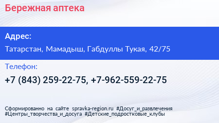 Бережная аптека по адресу Татарстан, Мамадыш, Габдуллы Тукая, 42/75 в дальнейшем Организация, размещена в следующих категориях: