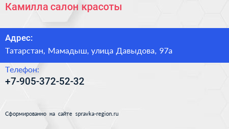 Камилла, салон красоты по адресу Татарстан, Мамадыш, улица Давыдова, 97а в дальнейшем Организация, размещена в следующих категориях: