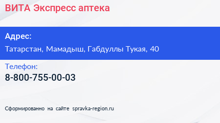ВИТА Экспресс, аптека по адресу Татарстан, Мамадыш, Габдуллы Тукая, 40 в дальнейшем Организация, размещена в следующих категориях: