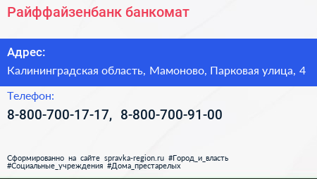 Райффайзенбанк, банкомат по адресу Калининградская область, Мамоново, Парковая улица, 4 в дальнейшем Организация, размещена в следующих категориях: