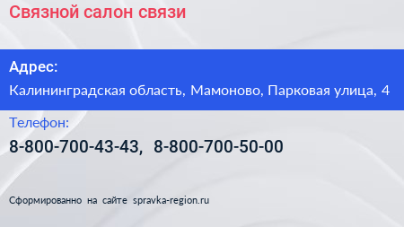 Связной, салон связи по адресу Калининградская область, Мамоново, Парковая улица, 4 в дальнейшем Организация, размещена в следующих категориях: