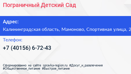 Пограничный Детский Сад по адресу Калининградская область, Мамоново, Спортивная улица, 2 в дальнейшем Организация, размещена в следующих категориях: