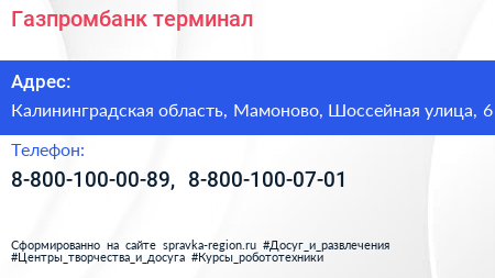 Газпромбанк, терминал по адресу Калининградская область, Мамоново, Шоссейная улица, 6 в дальнейшем Организация, размещена в следующих категориях: