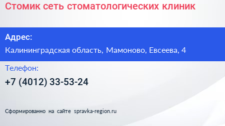 Стомик, сеть стоматологических клиник по адресу Калининградская область, Мамоново, Евсеева, 4 в дальнейшем Организация, размещена в следующих категориях: