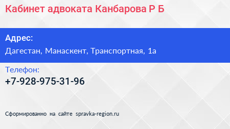 Кабинет адвоката Канбарова Р.Б. по адресу Дагестан, Манаскент, Транспортная, 1а в дальнейшем Организация, размещена в следующих категориях: