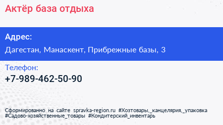 Актёр, база отдыха по адресу Дагестан, Манаскент, Прибрежные базы, 3 в дальнейшем Организация, размещена в следующих категориях: