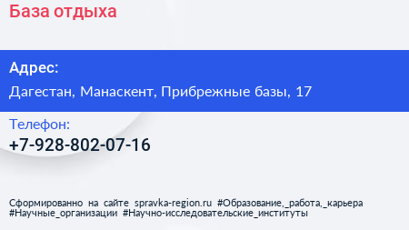 База отдыха по адресу Дагестан, Манаскент, Прибрежные базы, 17 в дальнейшем Организация, размещена в следующих категориях:
