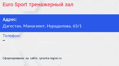 Euro Sport, тренажерный зал по адресу Дагестан, Манаскент, Нурадилова, 63/1 в дальнейшем Организация, размещена в следующих категориях: