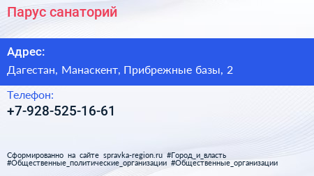 Парус, санаторий по адресу Дагестан, Манаскент, Прибрежные базы, 2 в дальнейшем Организация, размещена в следующих категориях: