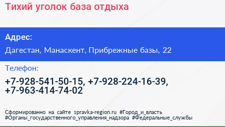 Тихий уголок, база отдыха по адресу Дагестан, Манаскент, Прибрежные базы, 22 в дальнейшем Организация, размещена в следующих категориях: