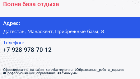 Волна, база отдыха по адресу Дагестан, Манаскент, Прибрежные базы, 8 в дальнейшем Организация, размещена в следующих категориях: