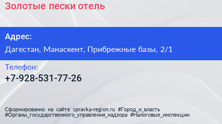 Золотые пески, отель по адресу Дагестан, Манаскент, Прибрежные базы, 2/1 в дальнейшем Организация, размещена в следующих категориях: