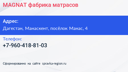 MAGNAT, фабрика матрасов по адресу Дагестан, Манаскент, посёлок Манас, 4 в дальнейшем Организация, размещена в следующих категориях: